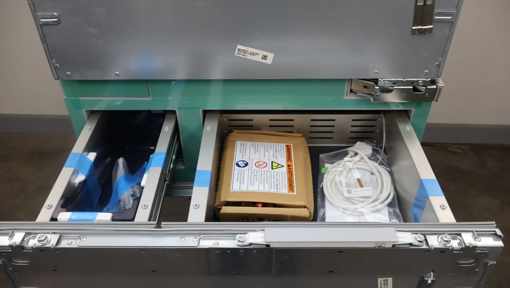 This unit is new out of box in good cosmetic condition. some flaws are shown in the pictures: 1-SMALL SCUFFS ON THE INSIDE OF REFRIGERATOR WALLS AND UNDER DRAWERS 2- LIGHT SCUFFS IN CORNERS OF TOP FREEZER DRAWER BIN 3- SCUFFS ON THE RIGHT SIDE OF THE UNIT (WILL NOT BE VISIBLE AFTER INSTALLATION) This unit comes with full functionality manufacturer warranty. This warranty does not cover cosmetic imperfections, functionality only. Pictures are of the actual unit.