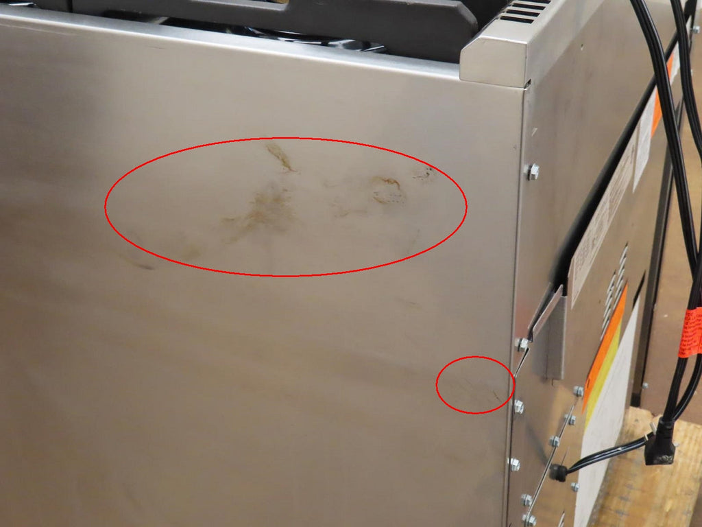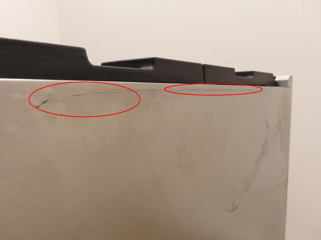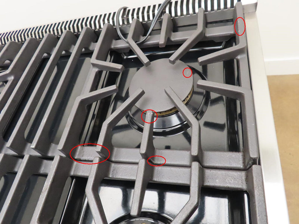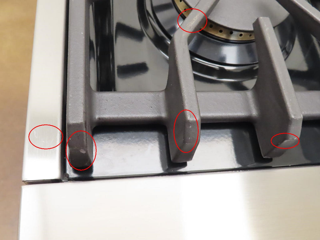 This unit is USED. Some flaws as shown in the pictures: 1-SCUFFS ON THE KNOBS (Pic 3). 2-SCRATCHES/SCUFFS ON THE HANDLE BAR/CAP (Pics 4 & 5). 3-DING ON THE TOP OF THE KICKPLATE (Pic 11). 4-SCRATCHES/SCUFFS ON TOP OF UNIT AND COOK TOP. 5-DISCOLORATION ON SOME GRATES. 6-SCUFFS/SCRATCHES/DICOLORATION ON RIGHT AND LEFT OF UNIT.