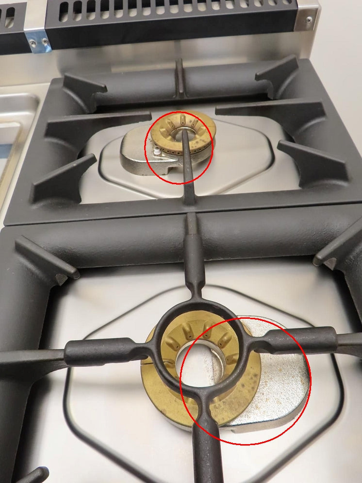 • Heavy-duty cast iron burner grates, coated in porcelain, offer exceptional heat retention and make cleaning up spills a breeze.
