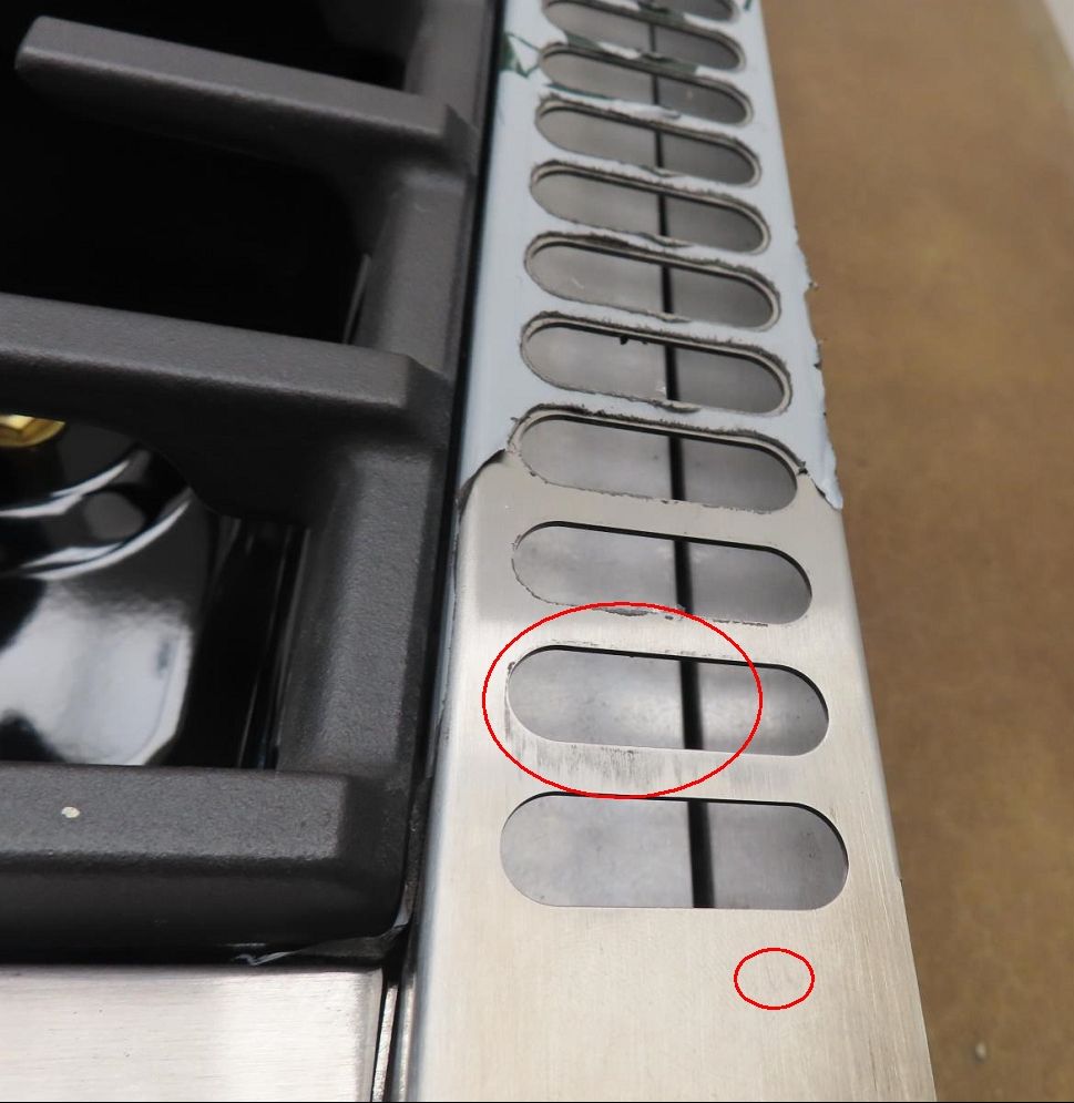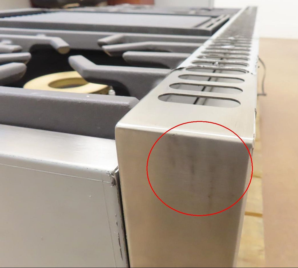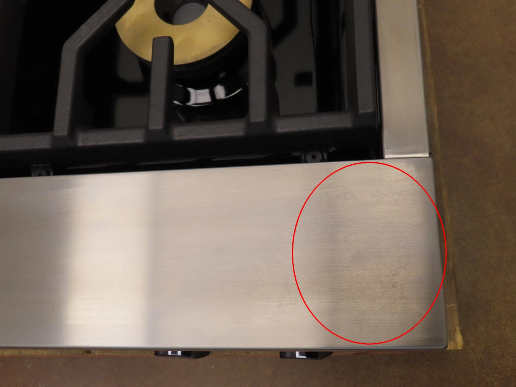 This unit is a new out of box in good cosmetic condition. Some flaws as shown in the pictures: 1-SCUFFS ON STAINLESS STEEL AROUND THE TOP OF THE COOKTOP. 2-DISCOLORATION ON THE BURNERS. 3-SMALL SCRATCHES ON THE FRONT OF THE GRATE/GRIDDLE.