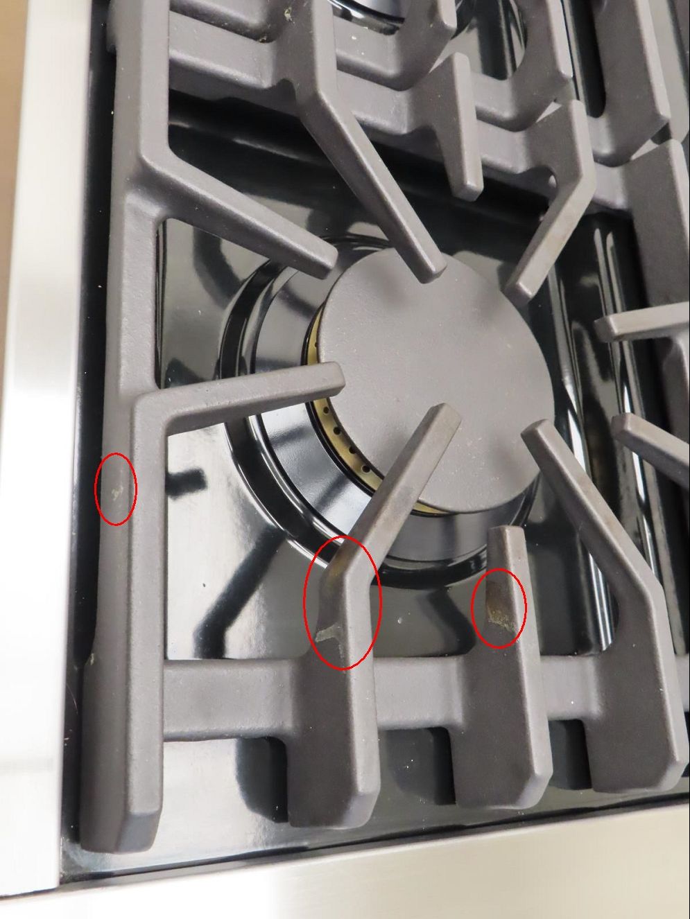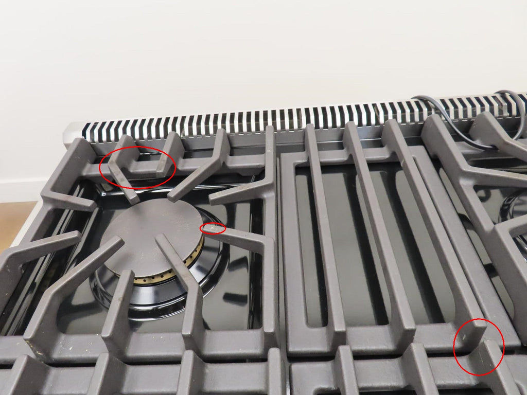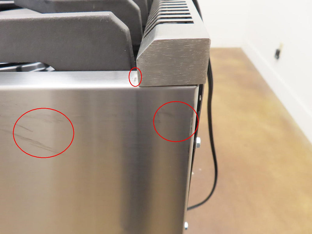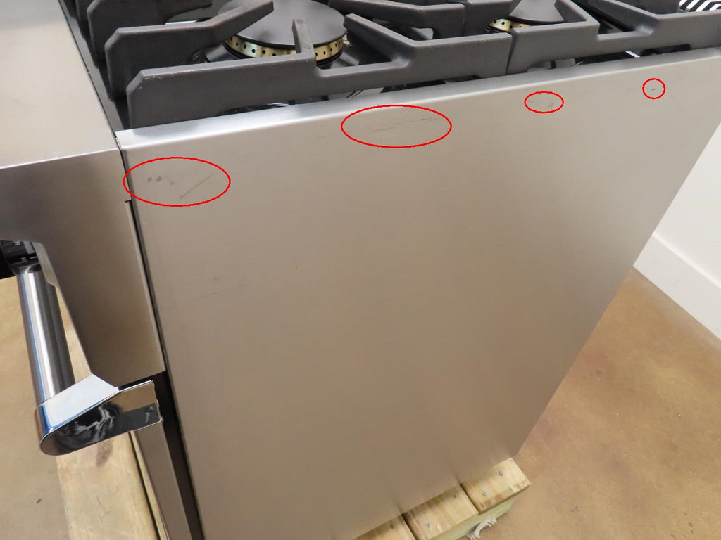 This unit is USED. Some flaws as shown in the pictures: 1-SCUFFS ON THE KNOBS (Pic 3). 2-SCRATCHES/SCUFFS ON THE HANDLE BAR/CAP (Pics 4 & 5). 3-DING ON THE TOP OF THE KICKPLATE (Pic 11). 4-SCRATCHES/SCUFFS ON TOP OF UNIT AND COOK TOP. 5-DISCOLORATION ON SOME GRATES. 6-SCUFFS/SCRATCHES/DICOLORATION ON RIGHT AND LEFT OF UNIT.