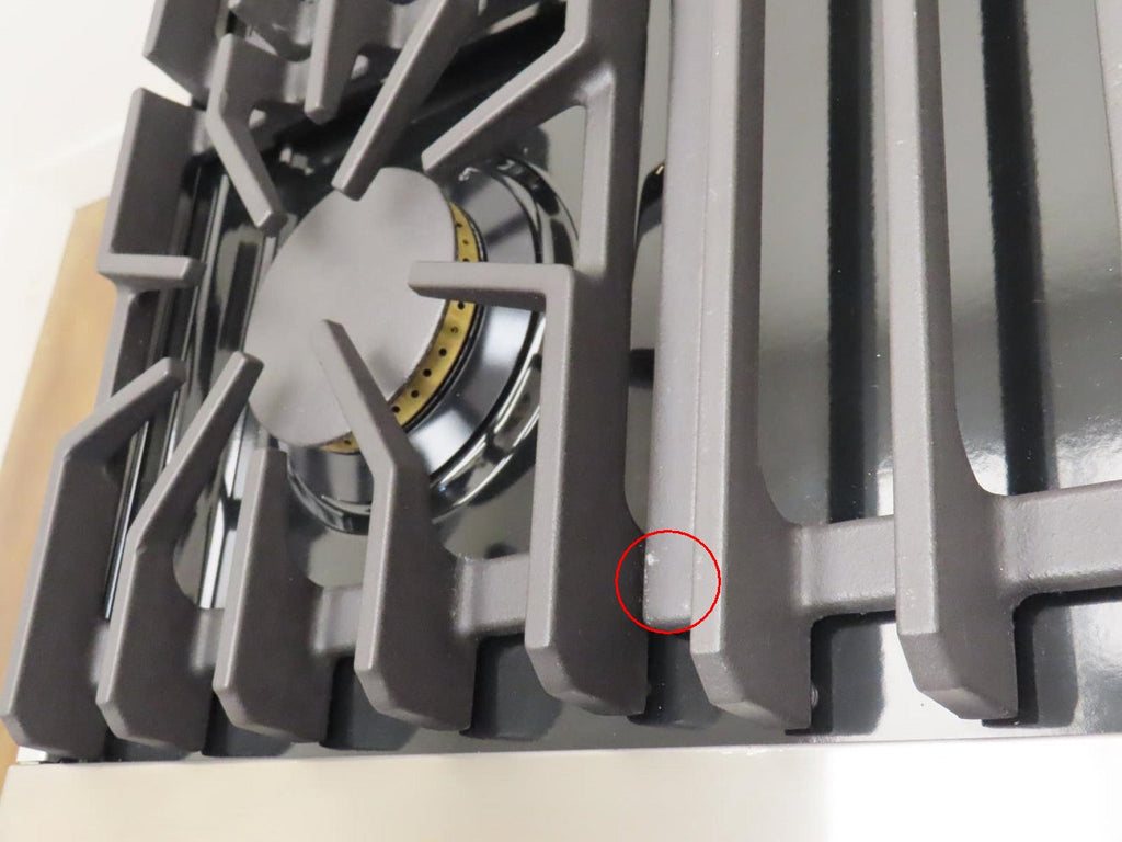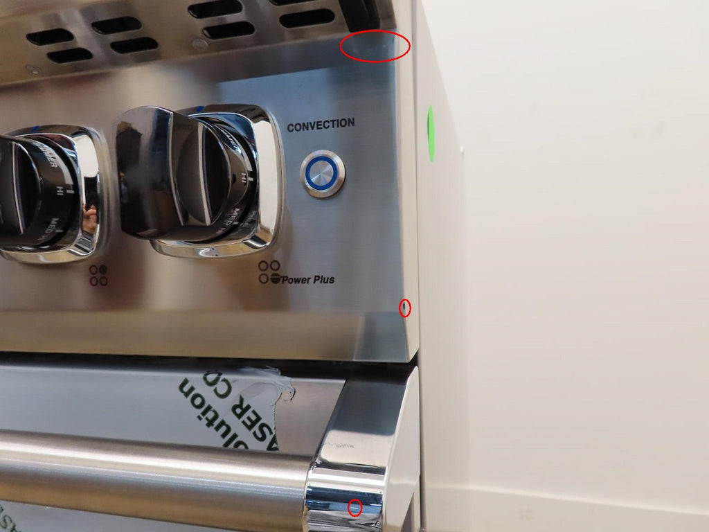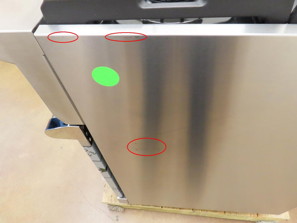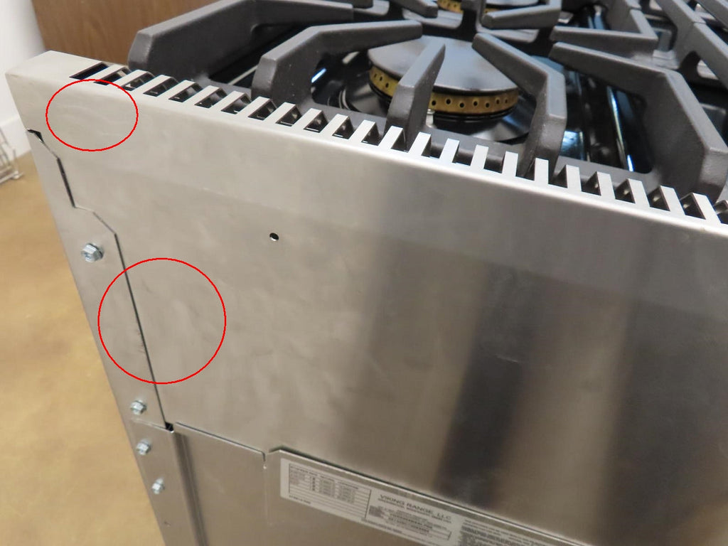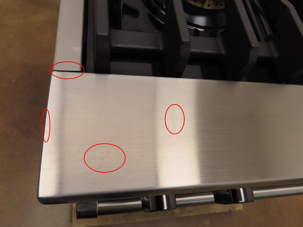 This unit is new out of the box in good cosmetic condition. Some flaws are shown in the pictures: 1-SCRATCHES/SCUFFS ON THE FRONT OF UNIT/KNOBS. 2-SCRATCHES ON THE INSIDE OF THE OVEN DOOR. 3-SCRATCHES/SCUFFS ON THE STAINLESS AROUND THE COOKTOP. 4-SCRATCHES/SCUFFS/DISCOLORATIONS ON THE COOKTOP, GRATES AND BURNERS. 5-SCRATCHES/SCUFFS ON THE LEFT, RIGHT , AND BACK SIDES OF THE UNIT.