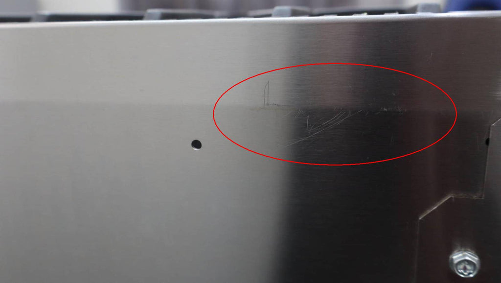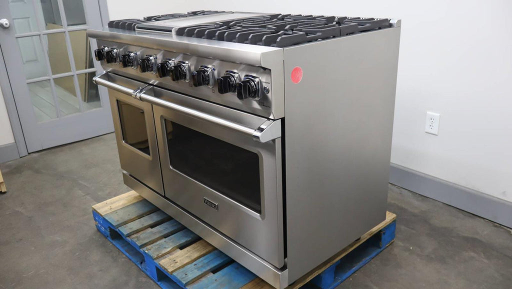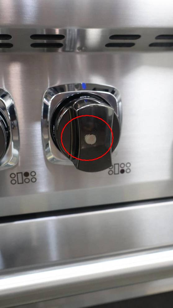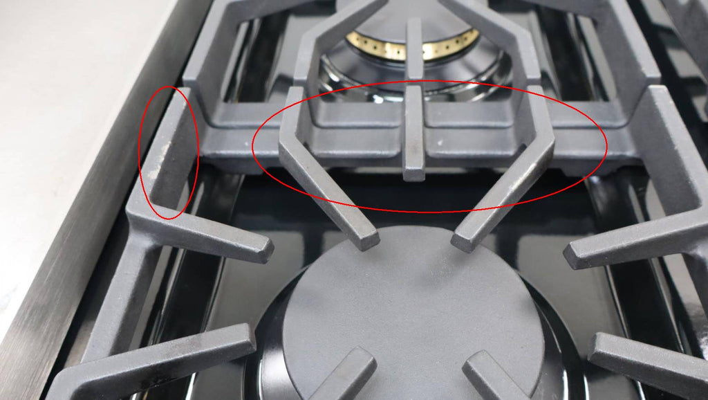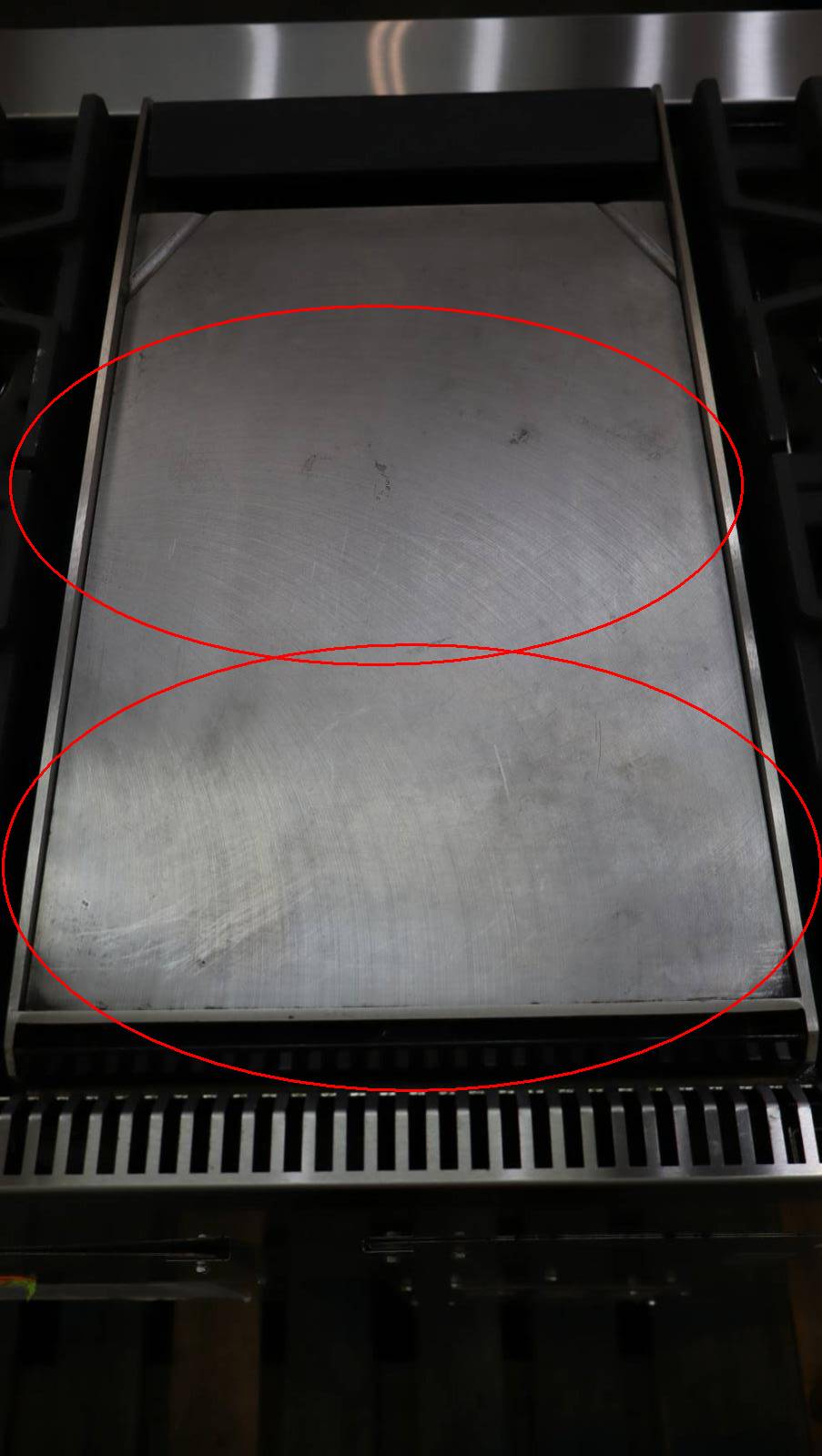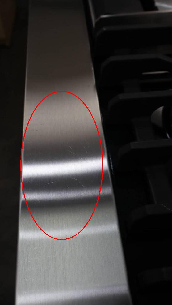 This unit is used. Some flaws are shown in the pictures: 1-SCRATCHES ON THE GRATES, GRIDDLE, AND STAILESS STEEL COOKTOP TRIM. 2-SCRATCHES AND DISCOLORATION ON UNIT KNOBS. 3-DISCOLORATION ON STAINLESS STEEL RACK/RAILINGS INSIDE OF UNIT. 4-SCRATCHING/SCUFFS INSIDE OF LARGE OVEN DOOR.